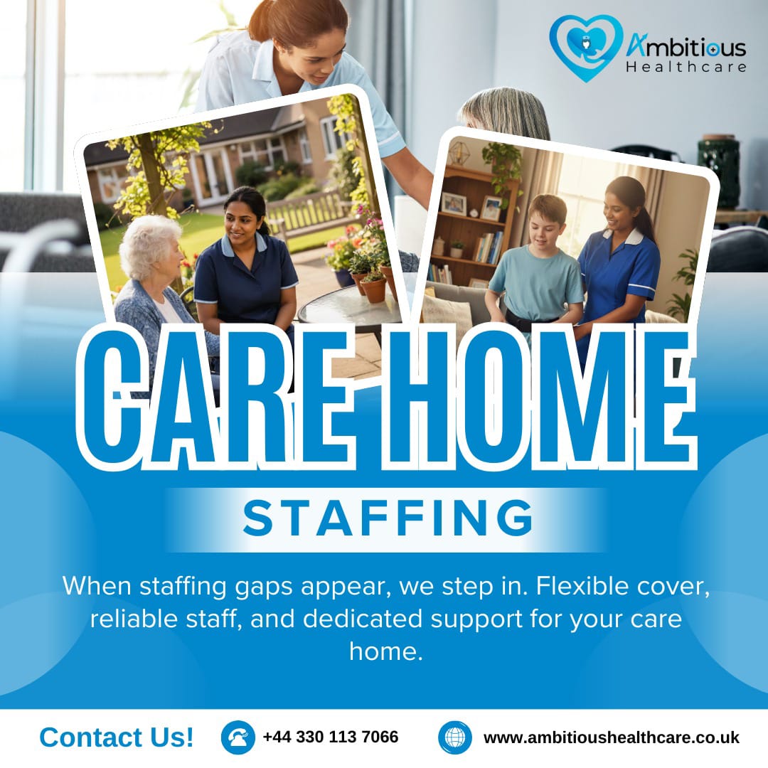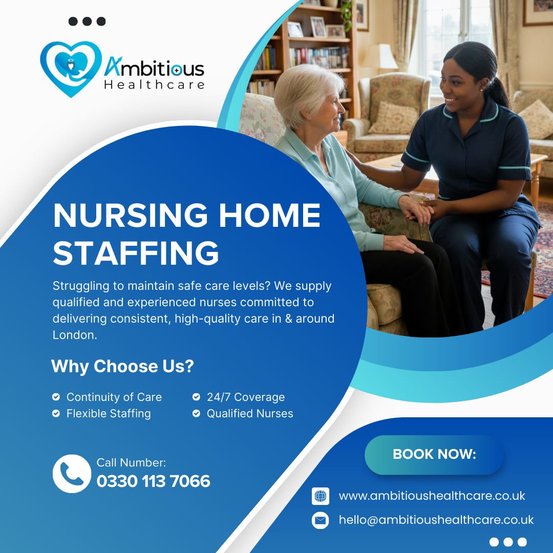 Ambitious Healthcare is a reliable healthcare staffing agency based in London, specialising in temporary staffing solutions for Care Homes and Nursing Homes. We supply fully trained Healthcare Assistants, Support Workers, Nurses, Domestic Staff, and Kitchen Assistants to ensure seamless cover during staff shortages, sickness, holidays, or periods of increased demand. Our team is known for its reliability, rapid response, and commitment to delivering high-quality care.